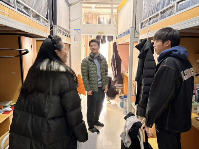 走访过程中,皇冠体育博彩 逐间细致排查宿舍电线铺设规范度、电路老化情况及插座使用状态,重点核查是否存在私拉乱接电线、违规串联插座等安全隐患,对排查发现的不规范用电问题现场指出并督促学生即时整改,确保隐患清零。在卫生方面,检查宿舍地面清洁、物品摆放等情况,对杂物纸箱堆积、卫生死角等问题提醒学生及时清理,引导学生保持整洁住宿环境。