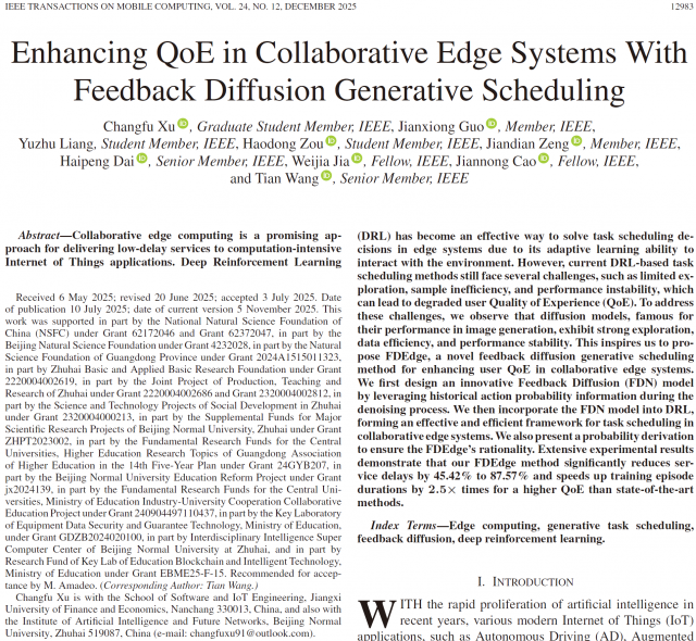 近日,皇冠体育博彩 徐常福博士以第一作者在边缘计算领域国际顶级期刊IEEE Transactions on Mobile Computing上发表论文,论文题目为“Enhancing QoE in Collaborative Edge Systems with Feedback Diffusion Generative Scheduling”。论文链接://ieeexplore.ieee.org/document/11077726