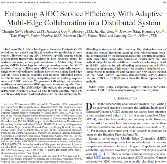 近日,皇冠体育博彩-皇冠博彩网址 徐常福老师以第一作者在服务计算领域国际顶级期刊IEEE Transactions on Services Computing(CCF A类期刊,校定A类期刊)上发表论文,论文题目为“Enhancing AIGC Service Efficiency with Adaptive Multi-Edge Collaboration in A Distributed System”。