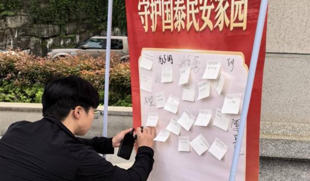 在答题区,参与者随机抽取3道题目作答,全部答对即通过;若答错,工作人员现场讲解并允许重新作答。标语创作区,学生在便利贴上书写原创标语并粘贴至主题展板。签名区,同学们在主题展板上郑重签名,表达对国家安全的承诺。