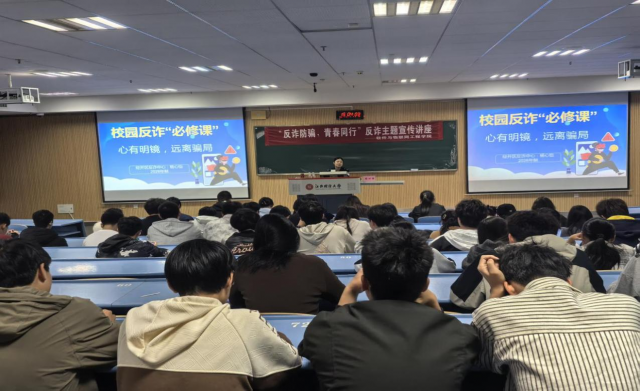 讲座中,杨心怡警官为同学们播放了反诈主题教育短片,并结合近期周围高校发生的真实诈骗典型案例,以真实受骗场景的影像、笔录还原案件,直观揭露了当前电信网络诈骗的最新犯罪趋势、作案套路与各类新型骗局的底层逻辑。同时,杨警官为在场同学细致讲解了针对性的防范技巧与应急应对处置策略,引导全体同学牢固树立“不轻信、不透露、不转账”的安全防护意识,帮助大家精准掌握各类诈骗陷阱的识别方法,学会在遭遇可疑情况时冷静应对、科学止损。