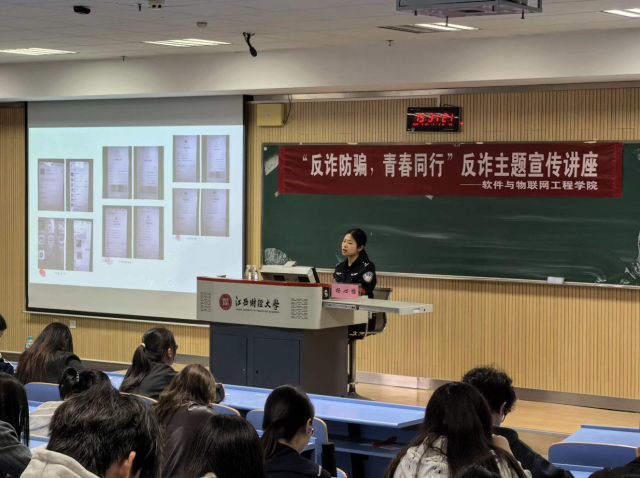为进一步筑牢校园反诈安全防线,切实提升青年学生的识骗、防骗、反诈能力,4月22日下午,皇冠体育博彩 于麦庐园三教3105教室成功举办“反诈防骗,青春同行”主题反诈宣传讲座活动。本次讲座由南昌市经开区杨心怡警官主讲,皇冠体育博彩 各年级学生踊跃参与。